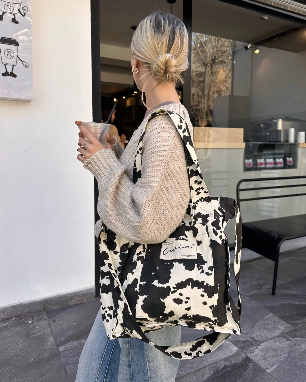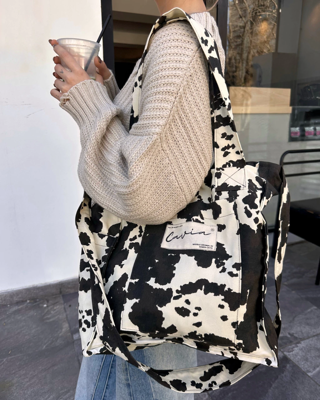 Bolso de tela bull estampado. Lleva cierre, bolsillo plaque adelante y al costado. Manijas cortas para usar tipo totebag y larga cruzada. Con forreria de lienzo de algodon.